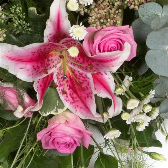 A pretty and feminine spray of pink and cream blooms including stargazer lilies, lisianthus and alstromeria.